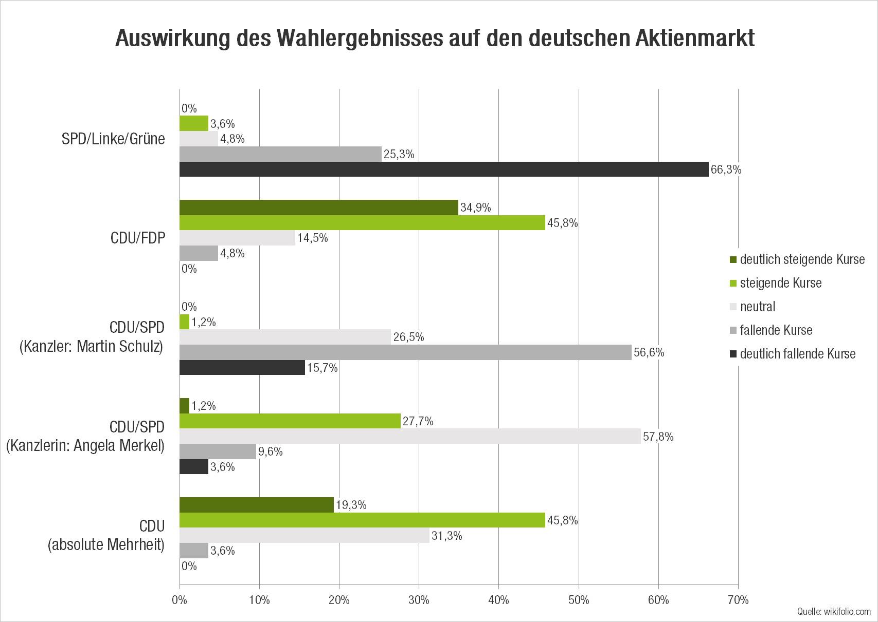 Eine deutliche Mehrheit, 80,7 Prozent, der wikifolio-Trader rechnen im Falle einer Koalition aus CDU und FDP mit steigenden (45,8 %) bis deutlich steigenden (34,9 %) Kursen auf dem deutschen Aktienmarkt. Das ist das Ergebnis einer Umfrage der Social-Trading-Plattform wikifolio.com. Zum Vergleich: Bei einer Regierungsbildung von SPD, „Die Linke“ und „Die Grünen“ glaubt keiner der Befragten an deutliche Kursanstiege. Mit steigenden Kursen rechnen bei dieser Konstellation nur 3,6 Prozent der Umfrageteilnehmer.