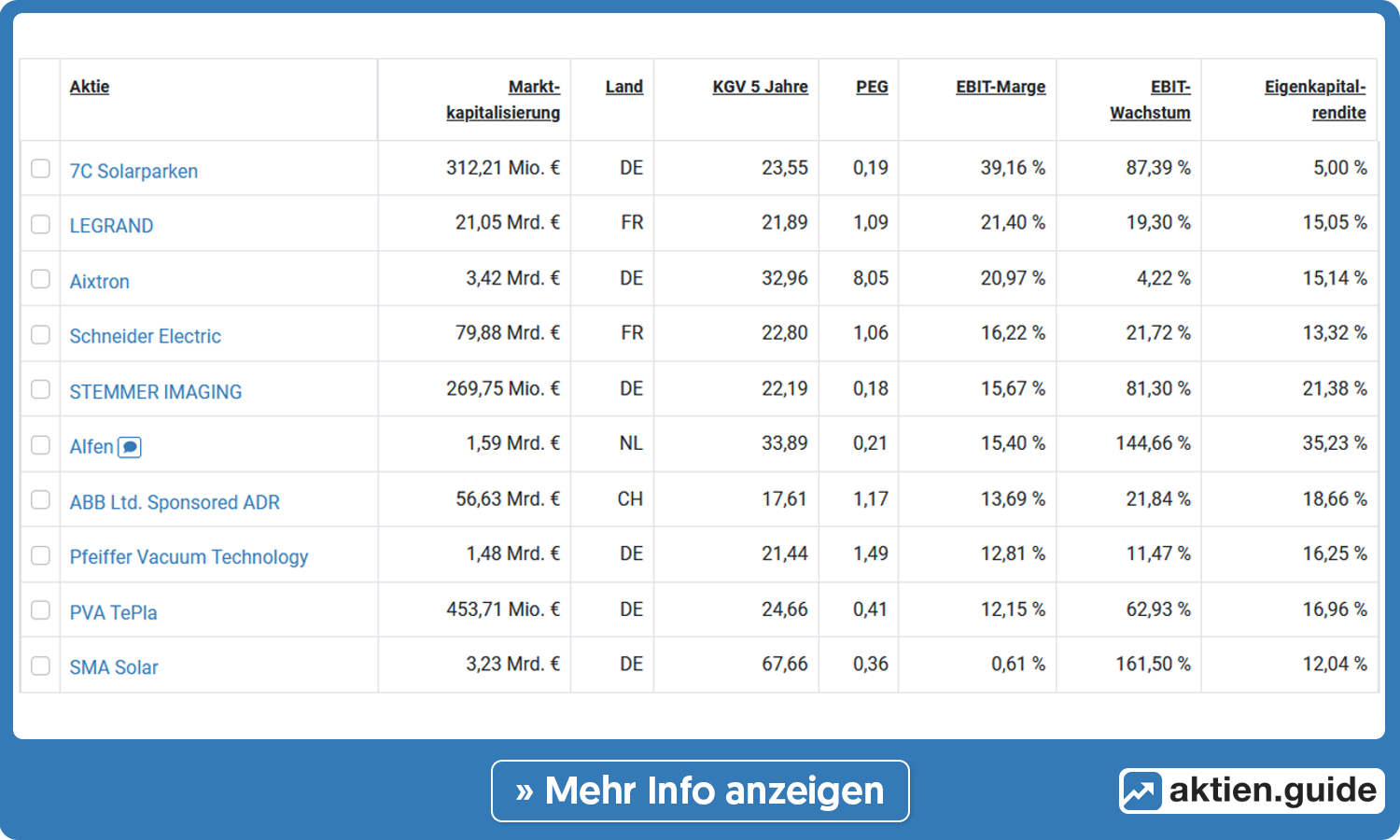 Im Startquartal 2023 hat sich die Sonne hierzulande relativ rar gemacht, was dem Spezialisten für Photovoltaikanlagen in Kombination mit einer gewissen Normalisierung der Strompreise nicht so gefallen dürfte. Folgerichtig rechnet der Vorstand im laufenden Jahr auch mit einem Rückgang von rund 24 Prozent beim EBITDA. Die Ziele für den Cashflow je Aktie 2023 und 2024 wurden angehoben, wobei das Vorjahresniveau auch hier deutlich unterschritten wird. 2022 war eben ein absolutes Ausnahmejahr für das Unternehmen. Das wird bei aktien.guide im Bereich der Elektrotechnologie angesiedelt und ist da in Westuropa der Wert mit der höchsten EBIT-Marge. Allerdings ist 7C Solarparken mit Blick auf die Marktkapitalisierung auch einer der kleinsten Player.