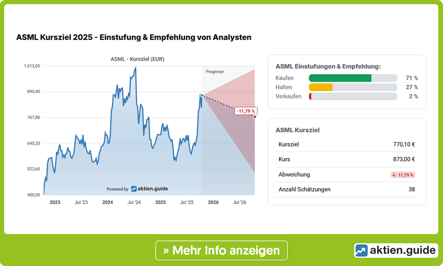 Die Analysten sind mit Blick auf die Wachstumschancen des Unternehmens ebenfalls zuversichtlich. Nach dem starken Kuranstieg der Aktie liegt das durchschnittliche Kursziel laut aktien.guide mit 770 Euro mittlerweile aber ein gutes Stück unter dem aktuellen Aktienkurs. Noch nicht berücksichtigt sind hier aber die gerade erst reinkommenden Updates der Analysten. Jefferies geht von 780 auf 795 Euro, die UBS von 940 auf 1.000 Euro und Goldman Sachs von 935 auf 1.050 Euro.