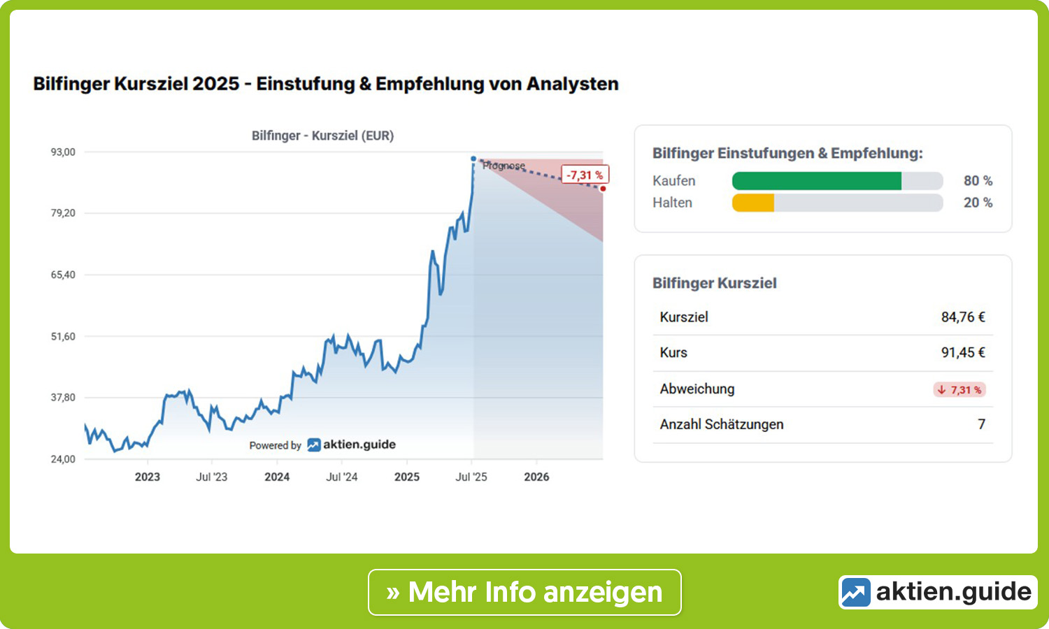 Fast 9 Prozent konnte der MDAX-Titel am Montag zulegen. Seit dem Jahreswechsel hat sich die Aktie damit nahezu verdoppelt. Neben einem charttechnischen Kaufsignal halfen gestern auch zwei Analystenhochstufungen. Kepler Cheuvreux erhöhte das Kursziel für Bilfinger von 78 Euro auf 95 Euro, bei Metzler traut man der Aktie statt 81,20 Euro nun sogar Notierungen von 100 Euro zu. Die Aktie kostet aktuell allerdings auch schon rund 93 Euro, so dass die Luft nach oben langsam dünn werden könnte. Laut aktien.guide sieht der Konsens den fairen Wert bei rund 85 Euro. Allerdings sind die beiden o.a. Updates in dieser Rechnung noch nicht enthalten. Demnach müsste das durchschnittliche Kursziel jetzt bei knapp 90 Euro liegen. Das ist aber immer noch weniger als die Aktie gerade kostet.