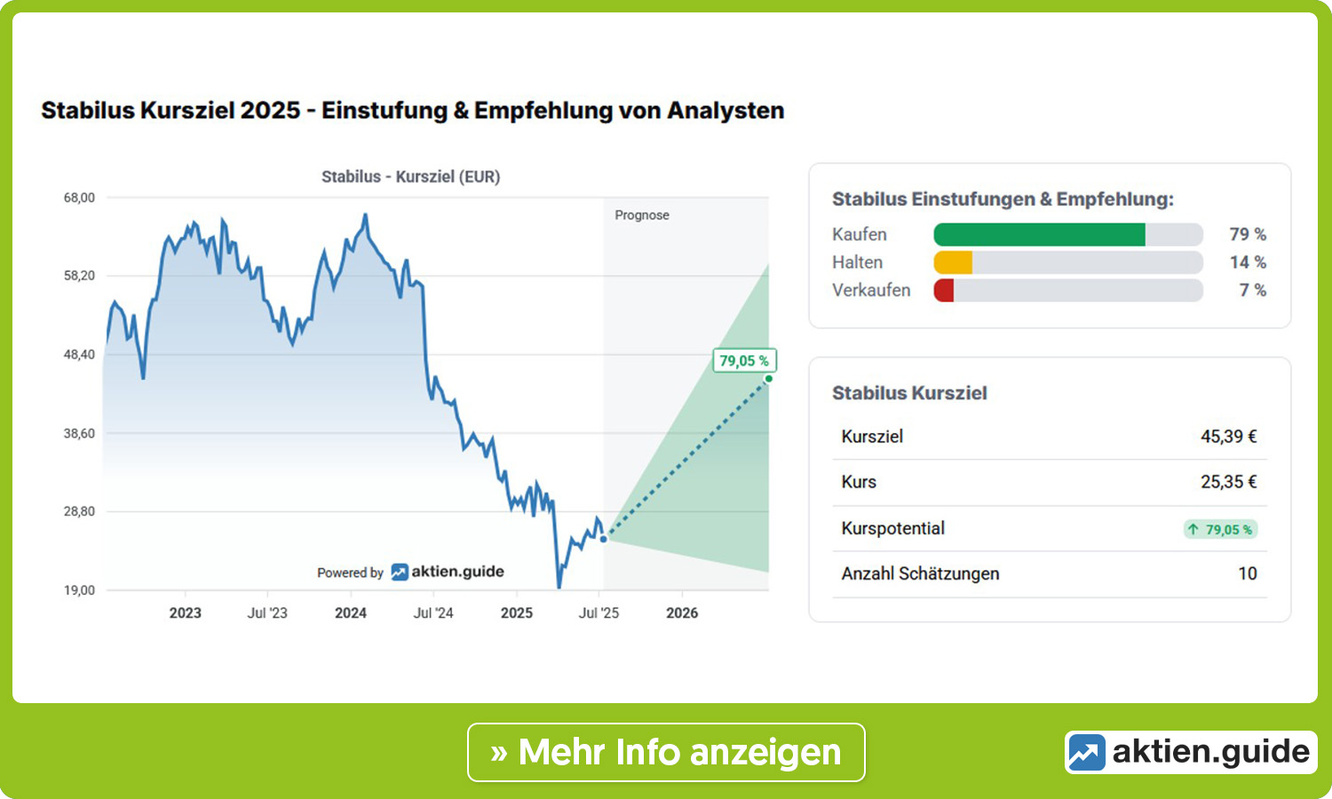 Ein pessimistischer Analystenkommentar hat die Aktie von Stabilus in der vergangenen Woche unter Druck gesetzt. Die Strategen von Warburg Research hatten ihr Kursziel für den Autozulieferer von 54 Euro auf 44 Euro reduziert und dies mit einem voraussichtlich schwachen zweiten Quartal begründet. Bei den Jahreszielen soll wahrscheinlich nur das untere Ende erreicht werden können. Weil damit aber keine Prognosesenkung drohe, wurde das „Kaufen“-Votum bestätigt. Auch weil das Kursziel immer noch sehr deutlich über der aktuellen Notierung von jetzt gut 25 Euro liegt. Das ist im Übrigen bei fast allen Researchhäusern der Fall. 11 von 14 Analysten stufen die Aktie als kaufenswert ein, nur einer rät bei einem Kursziel von gut 21 Euro zum Verkaufen. Im Schnitt wird der faire Wert der Aktie laut aktien.guide auf über 45 Euro taxiert. Diesem Konsenswert hat sich Warburg Research jetzt weitestgehend angeschlossen. Für die Aktie würde das ein Potenzial von fast 80 Prozent bedeuten.