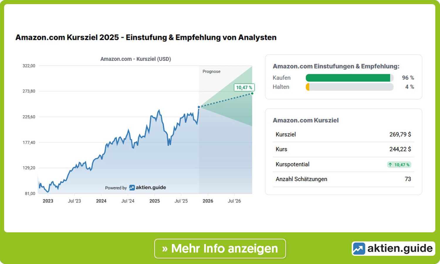 Nach Ansicht der UBS-Analysten deutet die starke Nachfrage nach den KI-Chips von Amazon auf die Freisetzung der von dem Unternehmen lange beschriebenen ,,gespannten Feder" hin. Das Kursziel wurde daraufhin von 279 Dollar auf 310 Dollar angehoben. Die Kollegen von Morgan Stanley sehen den fairen Wert der Aktie nun nicht mehr bei 300 Dollar, sondern bei 315 Dollar. Auch die meisten anderen Analysten rechnen mit weiter steigenden Kursen der Aktie, nachdem diese gerade auf ein neues Allzeithoch bei gut 250 Dollar gestiegen und danach wieder etwas abgerutscht war. Laut aktien.guide voten aktuell 75 Researchhäuser mit „Kaufen” und drei mit „Halten“. Das durchschnittliche Kursziel liegt demnach bei rund 270 Dollar, wobei hier in den kommenden Tagen wahrscheinlich noch einige Updates und auch Upgrades folgen werden.