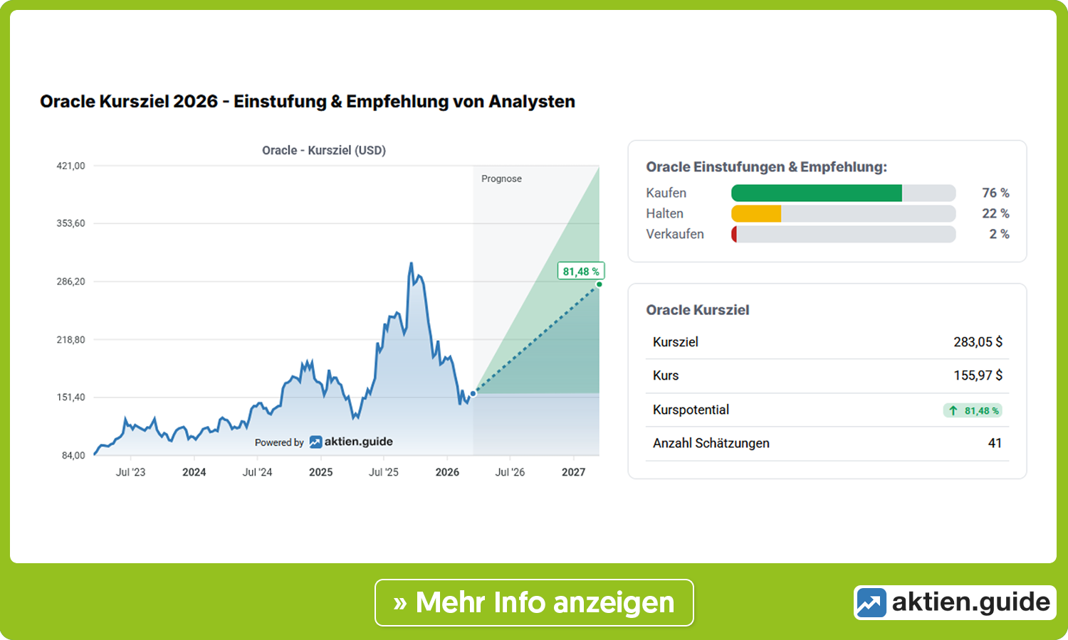 Genau an diesem Punkt versuchte der Vorstand zu beruhigen und betonte, dass viele der neuen KI-Verträge so strukturiert seien, dass die Kunden entweder vorab zahlen oder die benötigten GPUs selbst bereitstellen. Das würde das Finanzierungsrisiko begrenzen. Die Analysten von Wedbush sprachen im Anschluss von einer „großen Erleichterung“ für den Technologiesektor. Ohnehin sind die Banken immer noch sehr zuversichtlich. Das Konsenskursziel liegt laut aktien.guide mit 283 Dollar gut 80 Prozent über der aktuellen Notierung. Die größten Optimisten sehen den fairen Wert sogar bei 420 Dollar. Trotzdem setzen nach dem ersten Freudensprung bei der Aktie schnell auch wieder Gewinnmitnahmen ein.
