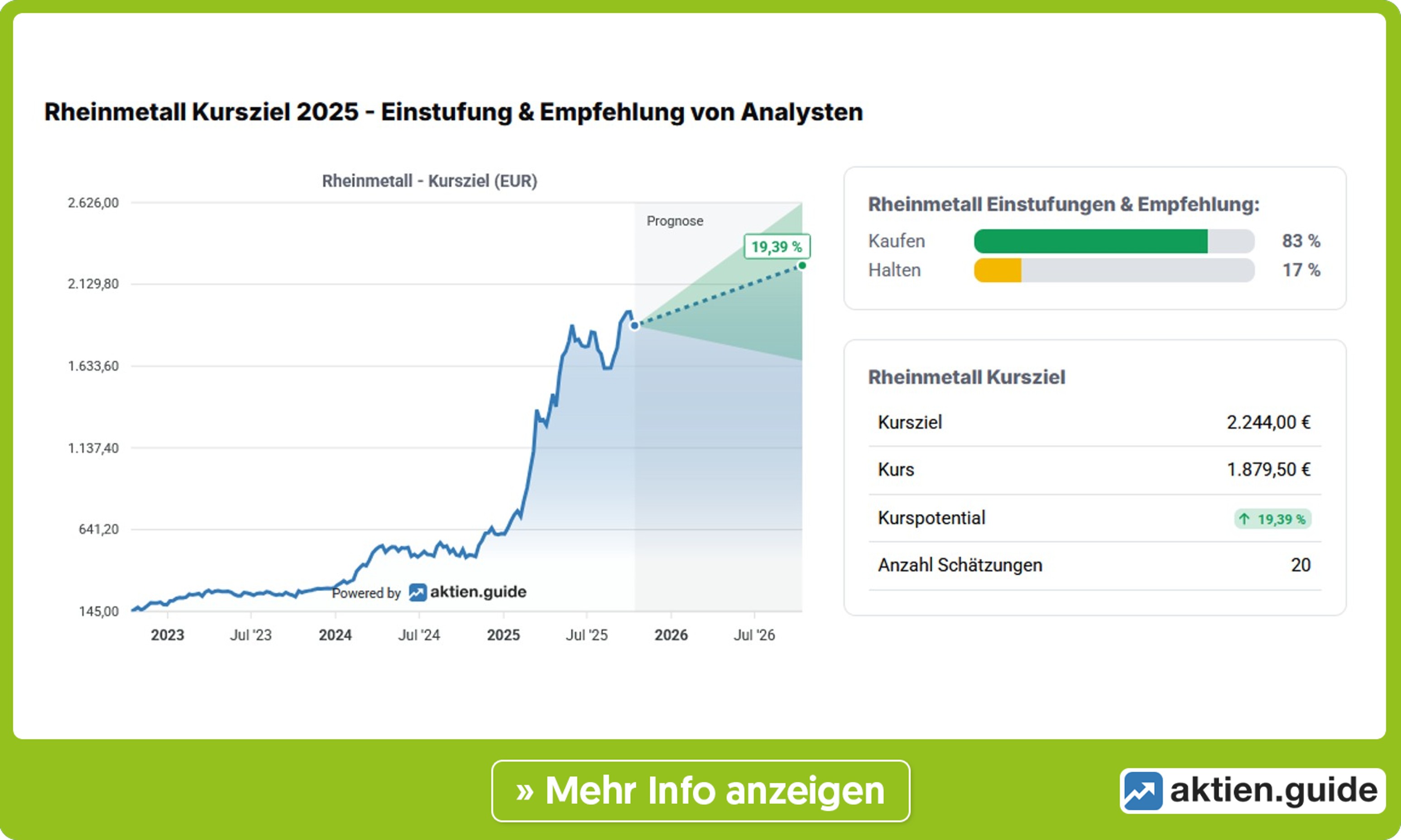 Die prognostizierten Wachstumsraten sind allerdings ebenfalls deutlich gestiegen. So sollen die Gewinne von 2025 bis 2027 im Schnitt um ca. 50 Prozent pro Jahr wachsen. Damit relativiert sich auch das auf den ersten Blick recht ambitioniert anmutende 12-Monats-KGV von aktuell 47. Analysten sehen wahrscheinlich auch deshalb den fairen Wert der Aktie fast 20 Prozent über der aktuellen Notierung. Laut aktien.guide liegt das Konsens-Kursziel bei 2.244 Euro.