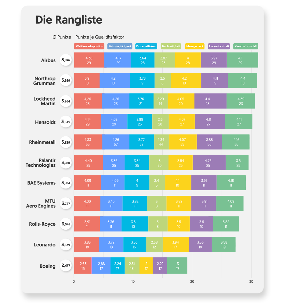 And the winner is… nicht . Die Krone holt sich Europas größter Luft- und Raumfahrtkonzern , gefolgt von den beiden US-Rüstungsschmieden und . Allerdings war es an der Spitze im Rahmen eines Aktien-Checks noch nie derart knapp. Die Top 7 kommen allesamt auf gut 3,8 Punkte. Auch Rheinmetall mischt ganz vorne mit. Genau wie das Software- und Big Data-Unternehmen . Sie alle überzeugen mit einer hohen finanziellen Risikotragfähigkeit, einer starken Wettbewerbsposition und ihrem Geschäftsmodell.