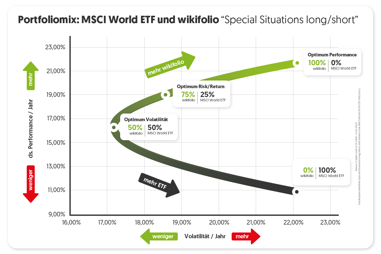 Die Grafik zeigt entlang der Kurve, wie sich Performance und Volatilität verändern, je nachdem wie hoch die Gewichtung von MSCI World ETF bzw. Special Situations long/short im Depot ausfällt. Und ja: Die Daten stimmen! Bei dem gewählten Mix entsteht eine nahezu lehrbuchartige Kurve, die das Volatilitätsoptimum bei einem 50/50 Split zeigt. Weitere Beispiele mit anders ausfallenden Kurven gibt es im wikifolio Magazine.