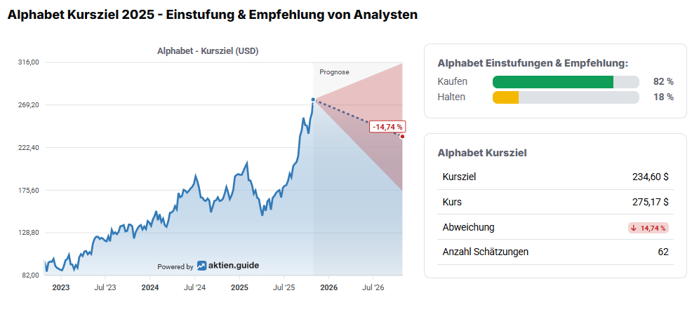Die Analysten von Jefferies haben ihr Kursziel für die US-Aktie nach der Zahlenvorlage von 285 auf 320 Dollar angehoben. Das Votum lautet weiterhin "Kaufen". Anderen Banken werden voraussichtlich folgen, sodass das Konsens-Kursziel ebenfalls deutlich nach oben gehen dürfte. Laut aktien.guide sehen die Researchhäuser den fairen Wert der Aktie bislang nur bei rund 235 Dollar, was deutlich unter dem aktuellen Kurs von Alphabet liegt. Trotzdem sprechen 60 von 73 Analysten eine „Kaufen“-Empfehlung aus, zum „Verkauf“ rät aktuell niemand. Das deutet auf Handlungsbedarf vonseiten der Analysten hin.