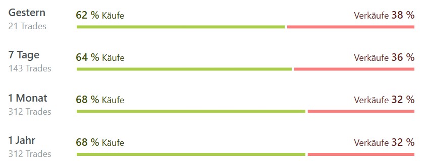 Bei den wikifolio Tradern überwiegt eindeutig der Optimismus. Fast zwei Drittel der jüngsten Transaktionen waren Käufe. Zu den fleißigsten Käufern zählt Andre Altieri-Bercz, in dessen wikifolio New World Technology die Aktie mit 7 Prozent Gewichtung die Top-Holding ist. Allerdings weist die Position aktuell einen Buchverlust von 20 Prozent aus. Das dürfte den Trader aber nicht groß stören. Schließlich ist seine Strategie langfristig ausgelegt, indem er in Unternehmen investiert, „die mit neuen Ideen oder Technologien ihre Branche umkrempeln oder schon eine marktführende Position innehaben“. Kurz vor dem zehnten Geburtstag des wikifolios liegt die Gesamtperformance bei 247 Prozent oder knapp 14 Prozent im Jahresdurchschnitt.
