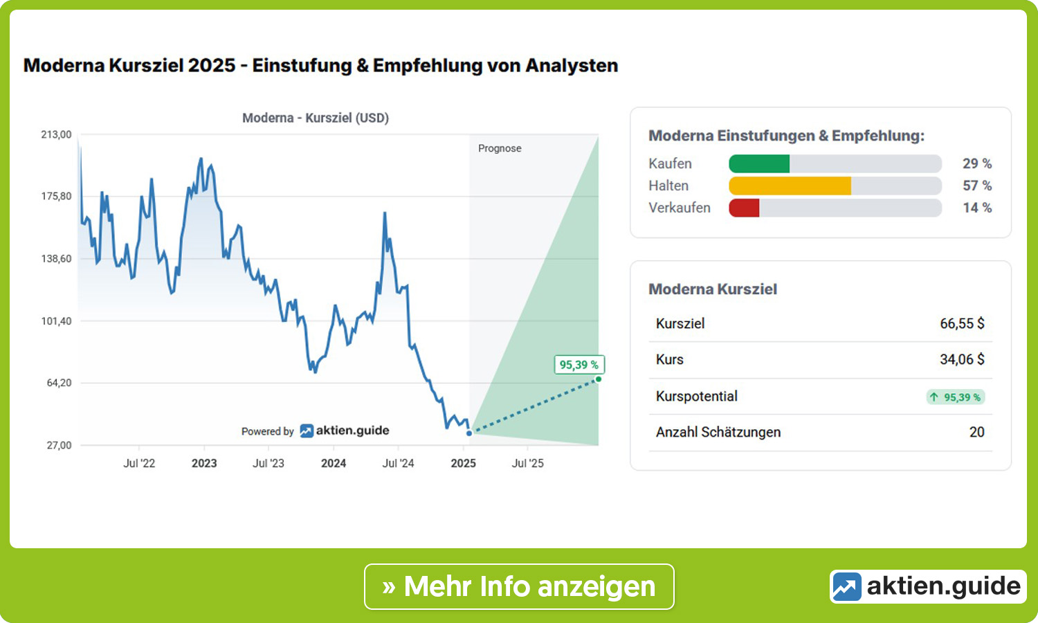 Die Analysten zeigen sich dennoch nicht zufrieden mit den veränderten Aussichten. Morgan Stanley zum Beispiel hat seine Umsatzerwartungen für die Jahre 2030 und 2035 von 7,9 Milliarden bzw. 10,9 Milliarden US-Dollar auf nur noch 5,5 Milliarden bzw. 7,8 Milliarden US-Dollar reduziert. Der faire Wert der Aktie wird daher nur noch auf 38 Dollar beziffert, nachdem es zuvor noch 70 Dollar waren. Die Zusammenfassung der vorhandenen Studien auf aktien.guide zeigt für Moderna aktuell noch ein durchschnittliches Kursziel von 66,55 Dollar, was 95 Prozent über dem aktuellen Aktienkurs liegt. Es ist aber durchaus möglich, dass es hier in den kommenden Tagen noch zu weiteren Abstufungen kommt. Zumal der Durchschnittswert durch positive Ausreißer (212 Dollar) nach oben verzerrt sein dürfte. Dafür spricht, dass über zwei Drittel der Analysten die Aktie mit „Halten“ oder „Verkaufen“ bewerten.