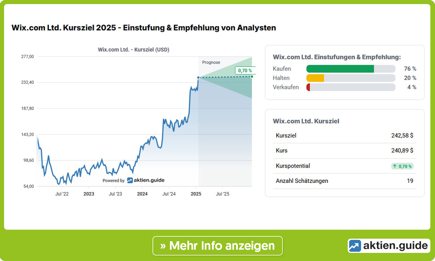 Der Aktie der israelischen Wix.com ist in der abgelaufenen Woche ein mustergültiger charttechnischer Ausbruch gelungen. Die knapp sieben Wochen lang andauernde Seitwärtskonsolidierung der Aktie wurde am Dienstag mit einem dynamischen Anstieg beendet. Die Wochenbilanz zeigt ein Kursplus von gut zehn Prozent. Der Titel notiert damit auf dem höchsten Stand seit August 2021. Profitiert hat der Anbieter einer Plattform zur Erstellung von Websites dabei von einer positiven Studie von Morgan Stanley. Deren Analysten haben die Aktie von Neutral auf Kaufen hochgestuft und das Kursziel von 248 auf 276 Dollar angehoben. Zur Begründung verwiesen die Strategen auf ein KI-getriebenes Wachstum, steigende Abonnementzahlen und die Erwartung, dass der verstärkte Fokus auf operative Disziplin zu einer höheren Free-Cash-Flow-Generierung führt. Mit dem neuen Kursziel liegt Morgan Stanley am oberen Ende einer Range, die laut aktien.guide von 205 bis eben 276 Dollar reicht und im Schnitt einen Konsenswert von 242,58 Dollar ergibt. Das liegt ungefähr auf Höhe des aktuelles Kursniveaus.
