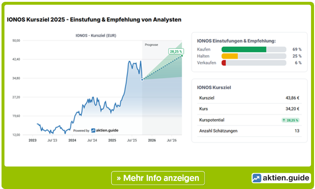 Nach starken Halbjahreszahlen hatte der Vorstand des Konzerns im August seine Jahresprognose angehoben. Die meisten Analysten zeigen sich begeistert. Laut Berenberg (Kursziel: 43 Euro) deutet die Auswertung von Webseite-Zugriffszahlen darauf hin, dass Ionos weiter auf einem positiven Kurs ist. Die Deutsche Bank und die UBS sehen den fairen Wert sogar bei 47 Euro. Die Schweizer bezeichnen die United-Internet-Tochter als „Profiteur des Megathemas Künstliche Intelligenz“. Das durchschnittliche Kursziel der Researchhäuser liegt laut aktien.guide knapp unter 44 Euro und damit fast 30 Prozent über dem aktuellen Kurs der Aktie. Die ist erst seit Februar 2023 an der Börse notiert und seit Juni im MDAX gelistet.