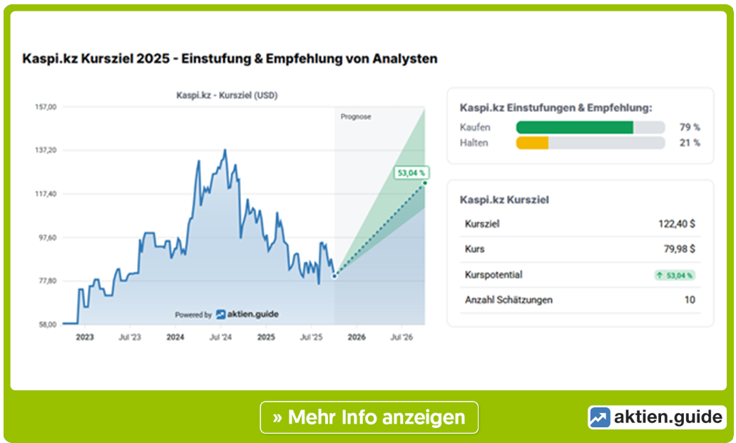Die Aktie gilt als relativ günstig bewertet, was sich auch in den Kurszielen der Analysten widerspeigelt. Der faire Wert von Kaspi.kz wird im Durchschnitt laut aktien.guide aktuell auf 122,40 Dollar taxiert. Im Vergleich zum derzeitigen Niveau der Aktie wäre das ein Aufschlag von satten 53 Prozent. Die Kursziel-Spanne der zehn hier hinterlegten Studien reicht von 111,10 Dollar bis 156,45 Dollar. Dementsprechend sind auch die „Kaufen-Voten“ klar in der Überzahl. Viele wikifolio-Trader glauben ebenfalls an ein Comeback, weshalb die jüngste Kursschwäche (minus 5 Prozent auf Wochensicht und minus 19 Prozent seit Mitte August) mehrheitlich zum Einstieg oder Nachkauf genutzt wurde.