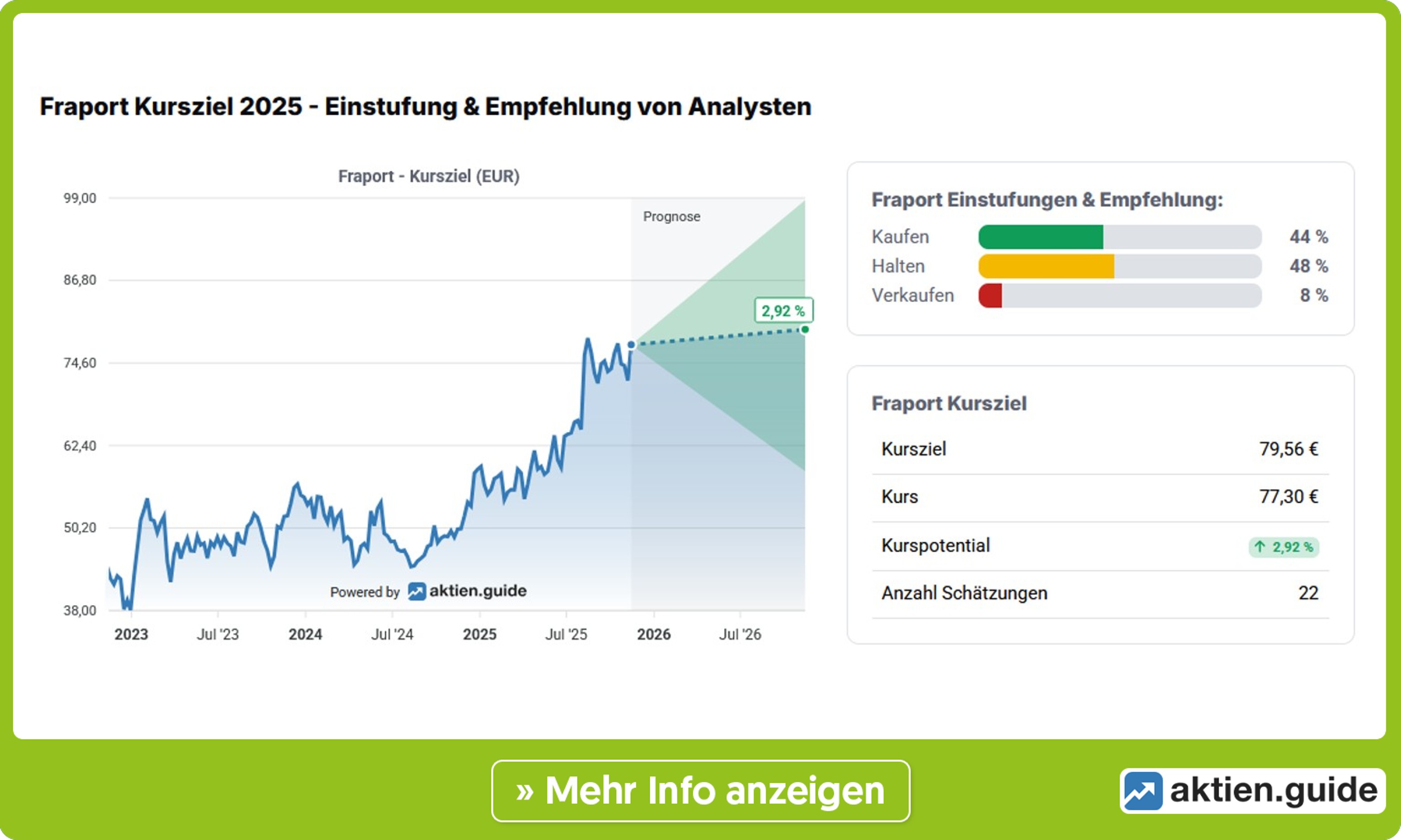 Die Analysten der britischen Investmentbank Barclays zeigen sich positiv überrascht von dem Gewinnsprung und loben vor allem die Ausgabendisziplin der Frankfurter. Der faire Wert der Aktie wurde daraufhin von 80 Euro auf 90 Euro angehoben, das Votum lautet unverändert „Overweight“. Die Kollegen von Jefferies interpretieren das Zahlenwerk trotz der weitgehend positiven Trends als einen „Geschäftsbericht mit Störgeräuschen“, weshalb sie Kursziel (72 Euro) und Empfehlung („Hold“) unverändert lassen. Im Durchschnitt liegt das Kursziel aller Analysten nach Berechnung von aktien.guide aktuell knapp unter 80 Euro und damit nahe am Kurs der Fraport-Aktie.