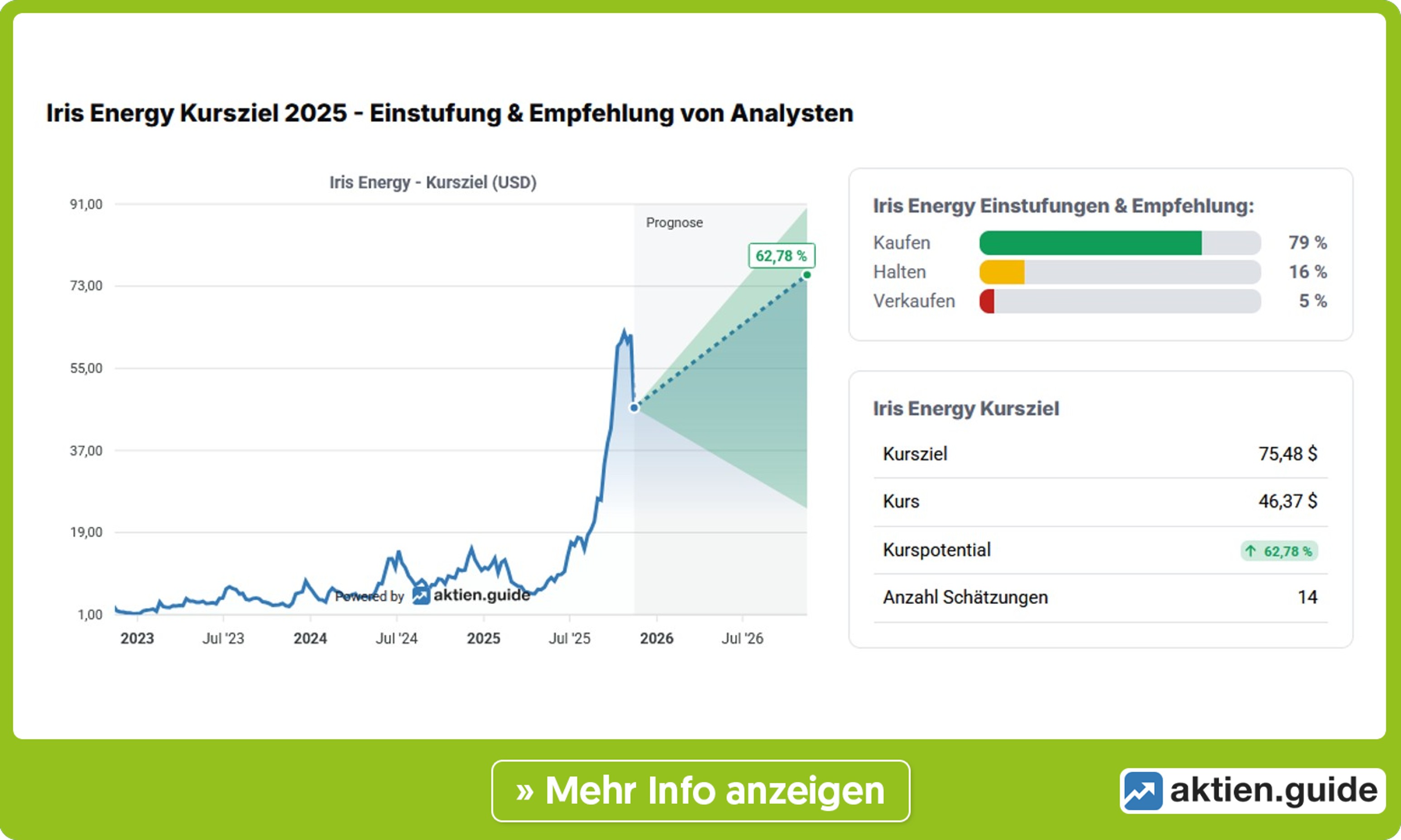 Der jüngste Rückschlag dürfte ebenfalls mit dem KI-Hype zu tun haben. Der bekam zuletzt nämlich erste Risse, weil sich viele Börsianer die Frage stellen, ob und wann sich die milliardenschweren Investitionen in die KI-Infrastruktur tatsächlich rechnen werden. Die meisten Analysten sind da noch sehr zuversichtlich. Laut aktien.guide empfehlen 15 von 19 Banken die Aktie von IREN um Kauf, das durchschnittliche Kursziel liegt mit rund 75,50 Dollar klar über dem aktuellen Kurs.