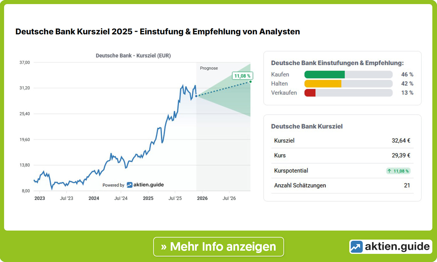 Obwohl die kommunizierten Ziele etwas über den Konsensschätzungen liegen, zeigen sich die meisten Analysten relativ unbeeindruckt. In Summe ist das Konsens-Kursziel in den vergangenen Tagen nur geringfügig gestiegen. Laut aktien.guide sehen die Researchhäuser den fairen Wert der Aktie aktuell bei 32,64 Euro. Nach den jüngsten Gewinnmitnahmen hätte die Deutsche Bank damit wieder ein knapp zweistelliges Kurspotenzial. Das höchste Kursziel liegt bei 36,75 Euro, das niedrigste bei 24,75 Euro. Damit befindet sich die Aktie fast genau in der Mitte der gesamten Range.