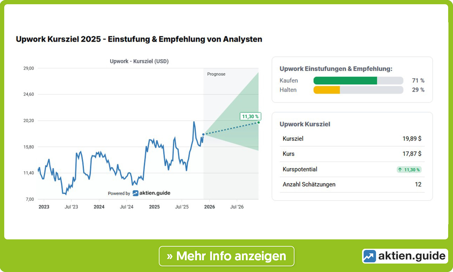 Im kommenden Geschäftsjahr will Upwork seine Erlöse um 6 bis 8 Prozent steigern. In den beiden Folgejahren soll das durchschnittliche jährliche Umsatzwachstum dann auf 13 bis 15 Prozent steigen und das bereinigte EBITDA im Schnitt rund 20 Prozent betragen. Die so genannte „Take-Rate“ (Provisionsanteil) soll von zuletzt rund 20 Prozent bis 2028 auf etwa 23 Prozent erhöht werden. Und dafür ist laut Vorstand keine Erholung des konjunkturellen Umfeld notwendig.