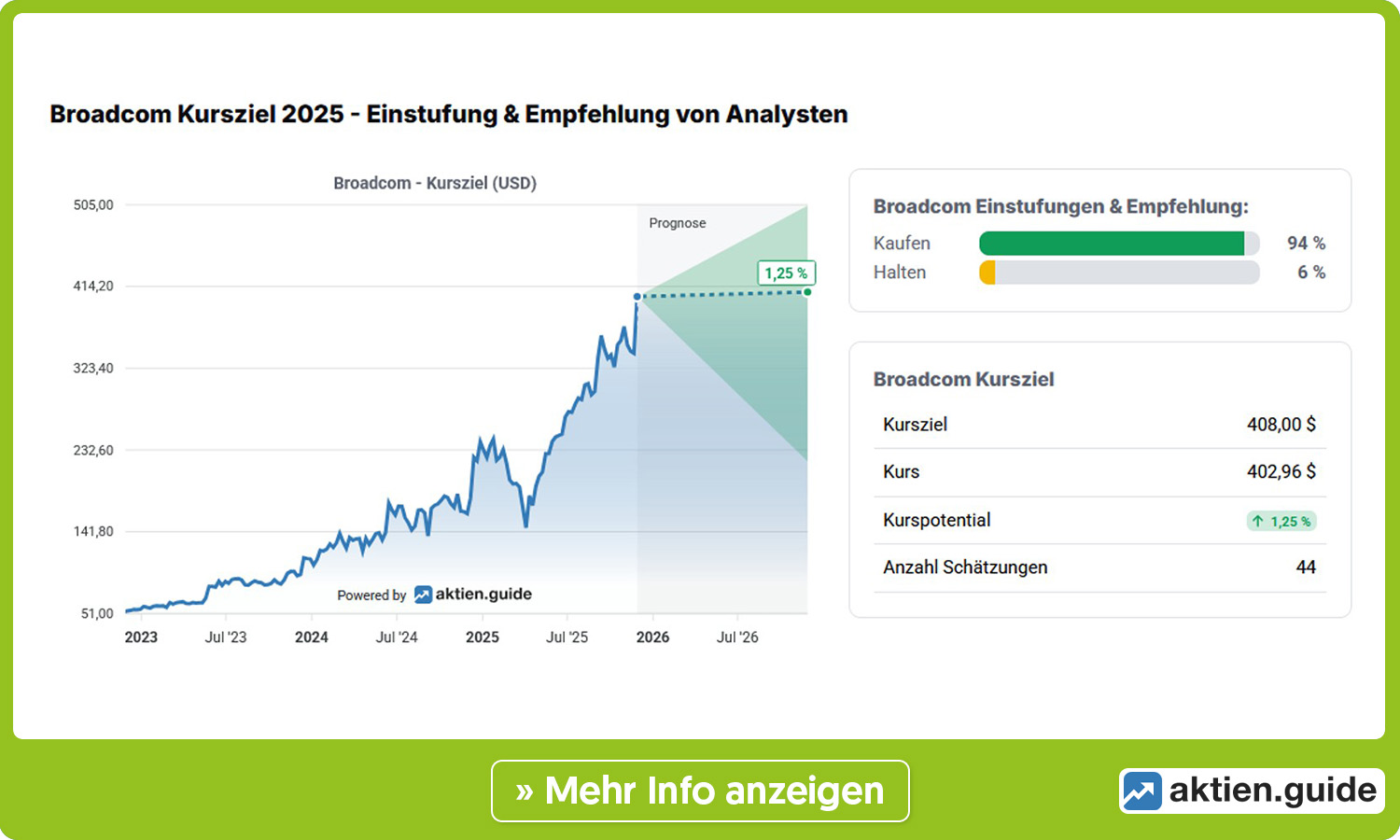 Die Aktie von Broadcom hat sich auf Sicht von drei Jahren fast verachtfacht und ist in diesem Jahr bislang um mehr als 70 Prozent gestiegen. Damit steuert der Halbleitergigant beim Börsenwert schnurstracks auf die Marke von 2 Billionen Dollar zu. Die Analysten kommen mit ihren Kurszielen bei dem dynamischen Kursanstieg gar nicht mehr hinterher. Laut aktien.guide voten zwar 94 Prozent des Banken mit „Kaufen“, das durchschnittliche Kursziel liegt mit 408 Dollar aber nur minimal über dem aktuellen Kurs der Aktie. Das passt nicht. Hier dürfte in den kommenden Tagen also einiges passieren.