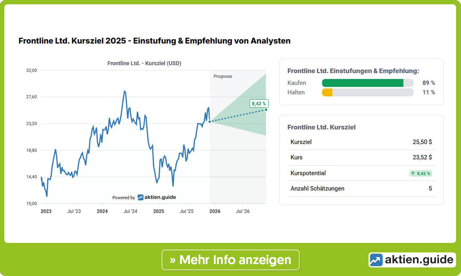 Die Aktie von Frontline war Mitte 2018 im Hoch zeitweise bis auf rund 360 Dollar geklettert, verlor danach aber satte 98 Prozent an Wert. Seit dem Jahr 2022 ist der Trend wieder aufwärtsgerichtet, wenn auch auf deutlich ermäßigtem Niveau. Aktuell kostet ein Anteilsschein ca. 23,50 Dollar. Laut aktien.guide sehen die Analysten den fairen Wert im Durchschnitt bei 25,50 Dollar und damit etwas höher. Vielleicht auch deshalb wurde der Rücksetzer vergangene Woche von den wikifolio Tradern mehrheitlich zum Einstieg genutzt.
