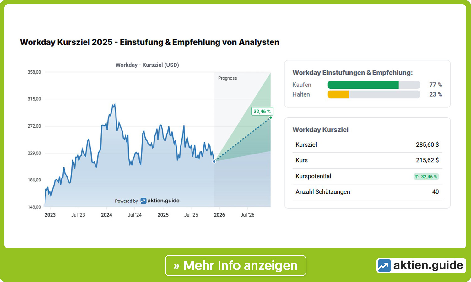 Der auf die Veröffentlichung von Cloud-basierter Management-Software für Unternehmen, Bildungseinrichtungen und Behörden spezialisierte Konzern setzt stark auf den Faktor Künstliche Intelligenz. Drei Viertel der Neuverträge sollen nach Angaben des Unternehmens bereits mindestens ein KI-Modul beinhalten. Viele Kunden sind im aktuellen Umfeld aber noch zurückhaltend. Das dadurch zurückgehende Wachstum mindert in Kombination mit einer als nicht günstige geltenden Bewertung die Fantasie vieler Investoren. Die Analysten sind derweil recht optimistisch. Die Daten bei aktien.guide zeigen ein durchschnittliches Kursziel, das mit rund 286 Dollar mehr als 30 Prozent über der aktuellen Notierung liegt. Viele Banken haben ihr Votum auch nach den Zahlen bestätigt.