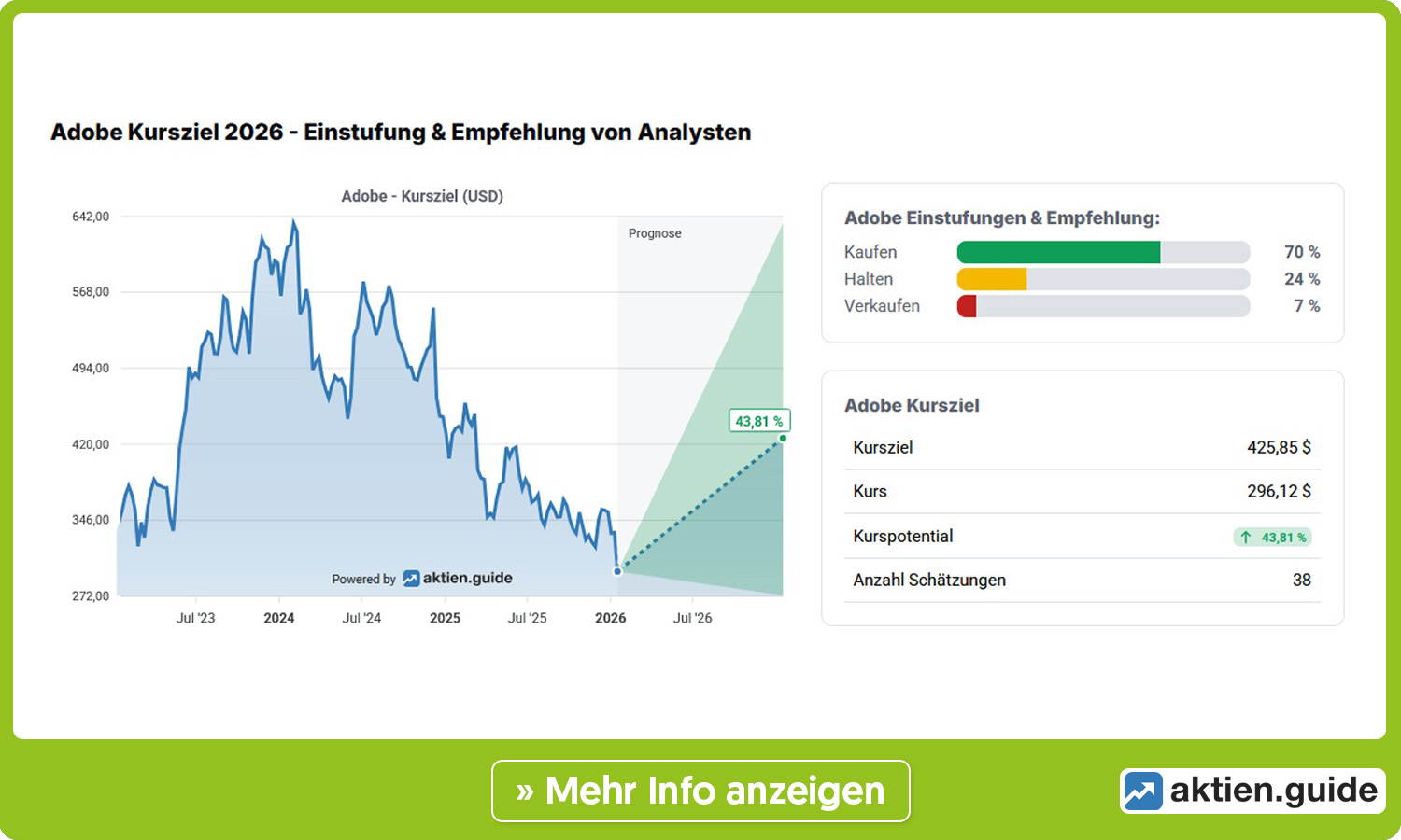 Gut möglich, dass nun noch mehr Analysten ihre Schätzungen für Adobe nach unten schrauben. In der vergangenen Woche hatten die Strategen von Oppenheimer die Aktie von „Outperform“ auf „Market Perform“ herabgestuft. Aktuell liegt das durchschnittliche Kursziel laut aktien.guide aber immer noch deutlich über der aktuellen Notierung. Auffällig ist dabei jedoch die große Spannbreite der einzelnen Kursziele, die von 272 Dollar bis zu 635 Dollar reichen.