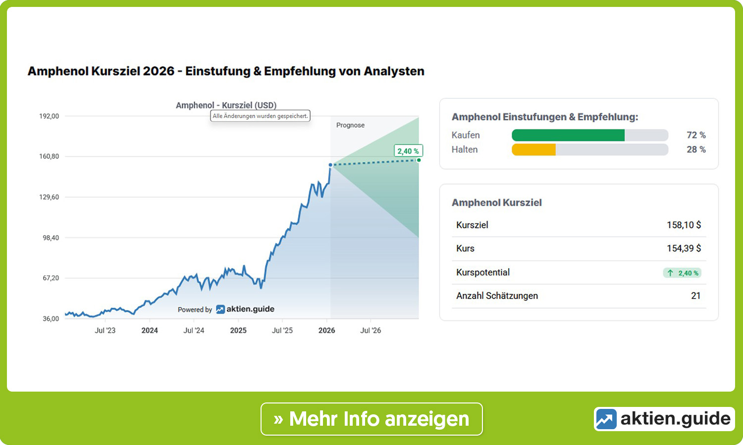 Auch im Aktienkurs hat sich dieser strukturelle Trend deutlich niedergeschlagen: Amphenol hat im Jahresverlauf 2025 starke Zugewinne erzielt und mehrfach neue Allzeithochs markiert. Auf Jahressicht hat sich der Titel mehr als verdoppelt und das neue Jahr startet direkt wieder mit neuen Rekorden. Die Kursziele der Analysten sind in dieser Phase nahezu im Gleichlauf mit der Aktie gestiegen. Dass der vermeintlich faire Wert mit gut 158 Dollar kein großes Potenzial mehr offenbart, muss deshalb nicht zwingend ein Hindernis für weitere Kursgewinne sein. Zumal das höchste Kursziel laut aktien.guide auch schon bei über 191 Dollar liegt. Die wikifolio Trader bleiben jedenfalls mehrheitlich optimistisch. Das aktuelle Trading-Sentiment zeigt bei Amphenol einen deutlichen Kaufüberhang.