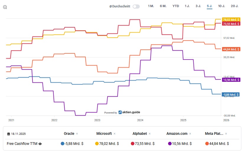 - Wegen dem Investitionsrausch geht’s dem für Aktionäre so wichtigen Free Cashflow (FCF) an den Kragen. Das ist jener Betrag, der nach Finanzierung des operativen Geschäfts und der Investitionen übrigbleibt und somit dem Unternehmen (bzw. den Aktionären) zur freien Verfügung steht. Grundsätzlich erwirtschaften alle außer Oracle einen positiven Free Cashflow. Bei Amazon und Meta wird er seit Ende 2024/Anfang 2025 kleiner. Laut Lisa Shalett, Chief Investment Officer bei Morgan Stanley Wealth Management, könnte der Free Cashflow der Hyperscaler Schätzungen zufolge in den nächsten 12 Monaten um 16 % schrumpfen. Wenn der FCF schrumpft, werden laut Shalett die Unternehmensbewertungen in Frage gestellt und die Investoren daher vorsichtiger.