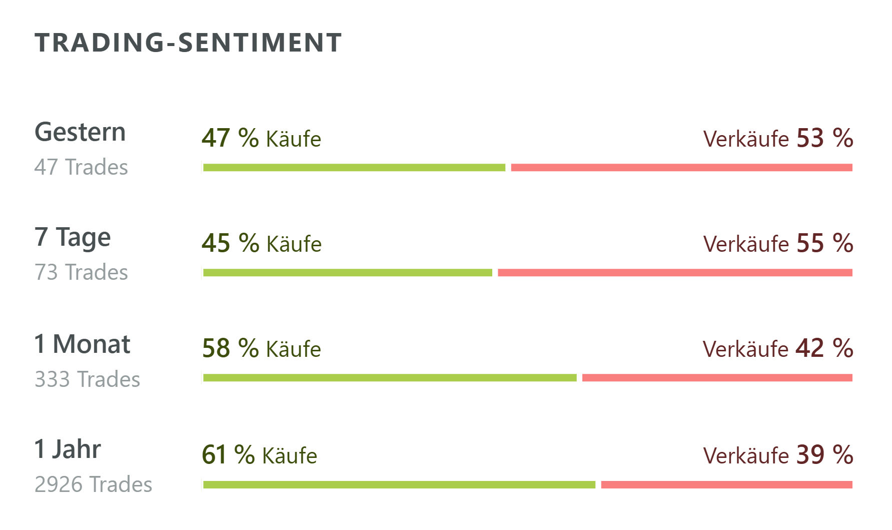 Mehrere wikifolio Trader scheinen dem Braten aber noch nicht so richtig zu trauen. Das aktuelle Trading-Sentiment zeigt kurzfristig einen leichten Verkaufsüberhang bei SMA Solar. Julian Mirus zum Beispiel hat die Kursexplosion zur Wochenmitte genutzt, um die Aktie mit einem Gewinn von 33 Prozent aus seinem wikifolio Bunte Tuete zu entfernen. Aufgebaut hatte er die Position rund um den jüngsten Jahreswechsel.