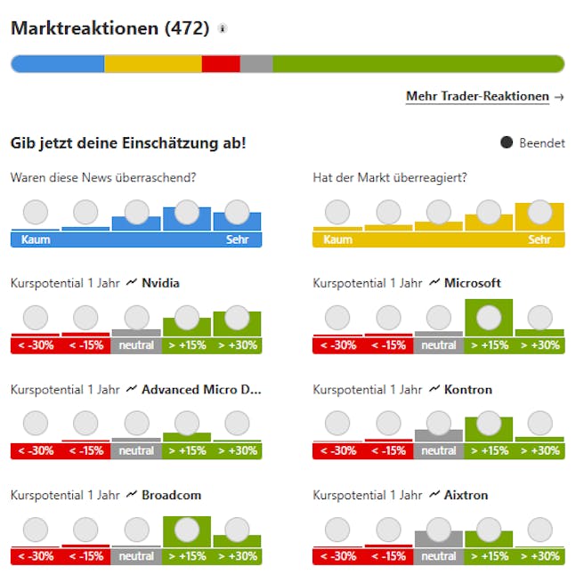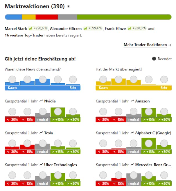 Die Marktreaktionen: In den 390 Marktreaktionen zeigt sich ein bullishes Gesamtbild etwa für die Aktien von Nvidia, Amazon oder auch Alphabet. Die Community erwartet hier mehrheitlich deutlich steigende Kurse binnen Jahresfrist. Im Falle von Tesla sind die Bären in der Überzahl. Verluste musste seither tatsächlich auch nur das Papier des E-Autobauers hinnehmen (-4 Prozent). Allerdings ist das Jahr noch jung… zu jung, um Tesla bereits abzuschreiben.