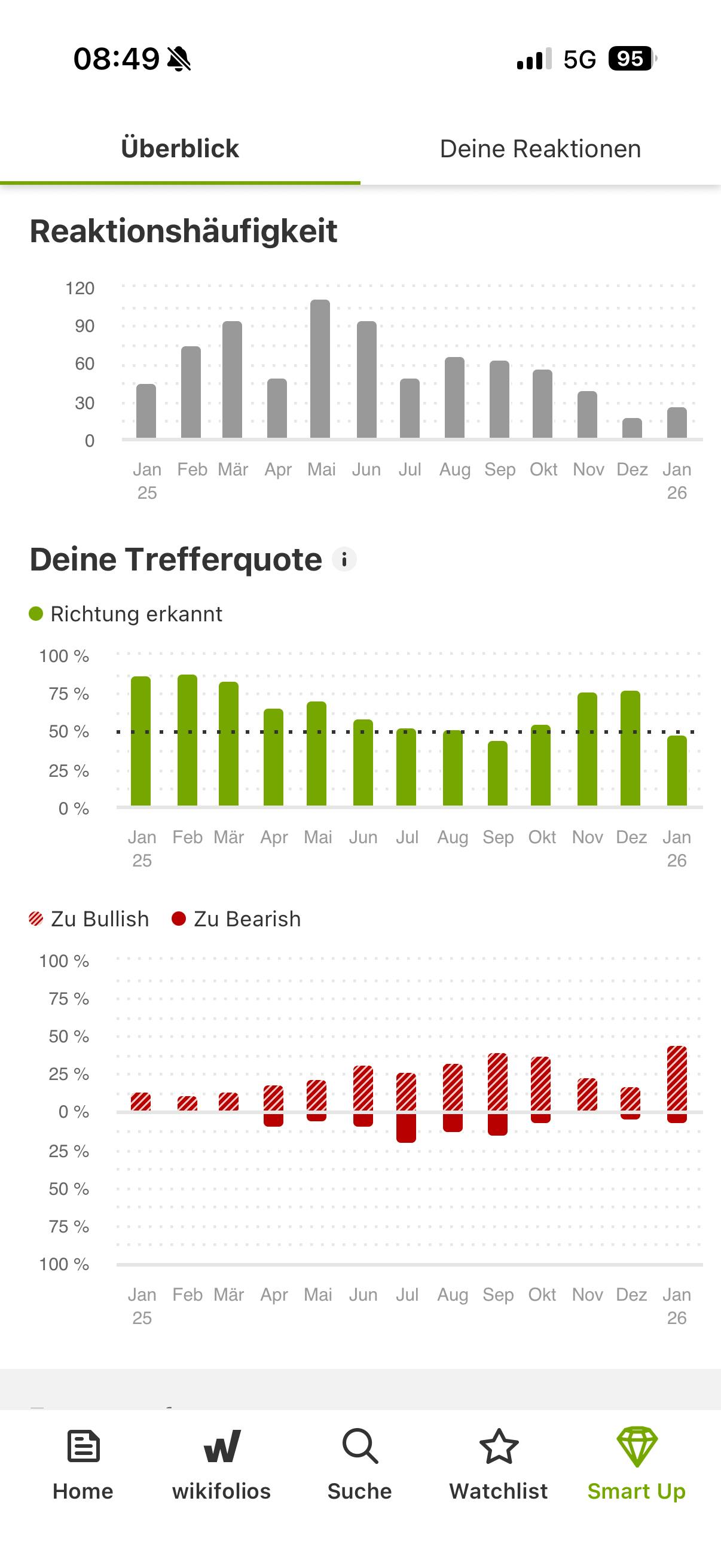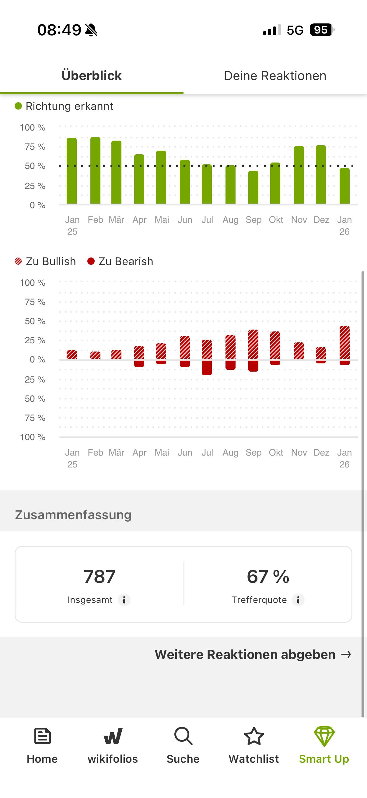 Du kannst als Teil der wikifolio Community natürlich ebenfalls auf News-Beiträge reagieren und deine bullishe, bearishe oder neutrale Stimme zu Aktien abgeben. So kannst du deine Meinung mit der Einschätzung der wikifolio Trader vergleichen. Im „Smart Up“-Tab der wikifolio Smart News App erfährst du außerdem, wie gut du dich geschlagen hast. Du siehst die Anzahl deiner Reaktionen in den letzten 13 Monaten und deine Trefferquote – im Überblick oder im Detail inklusive der News, auf die du reagiert hast. Hättest du besser abgeschnitten als die Vermögensverwalter von Oberbanscheidt & Cie?