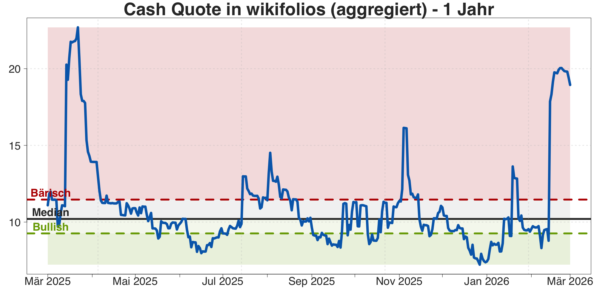 Die aggregierte Cash-Quote in wikifolios liegt aktuell bei 18,9% (Stand 17.03.2026) und damit deutlich über den Durchschnittswerten der letzten Jahre. Besonders spannend: Im Verlauf der letzten vier Wochen ist die Quote um 9,6 Prozentpunkte gestiegen und kommt somit nahe an das Hoch aus dem April des Vorjahres heran (damals rund 22%). wikifolio Trader hatten sich aufgrund des Trump'schen "Zollhammers" zu dieser Zeit vorübergehnd defensiv positioniert. Nach einer längeren Risk-On-Phase zu Jahresbeginn wurden Positionen zuletzt wieder gegen die aktuelle Volatilität abgesichert. Zudem bleiben die Trader derart flexibel für Käufe, sobald sich die Gelegenheit ergibt.