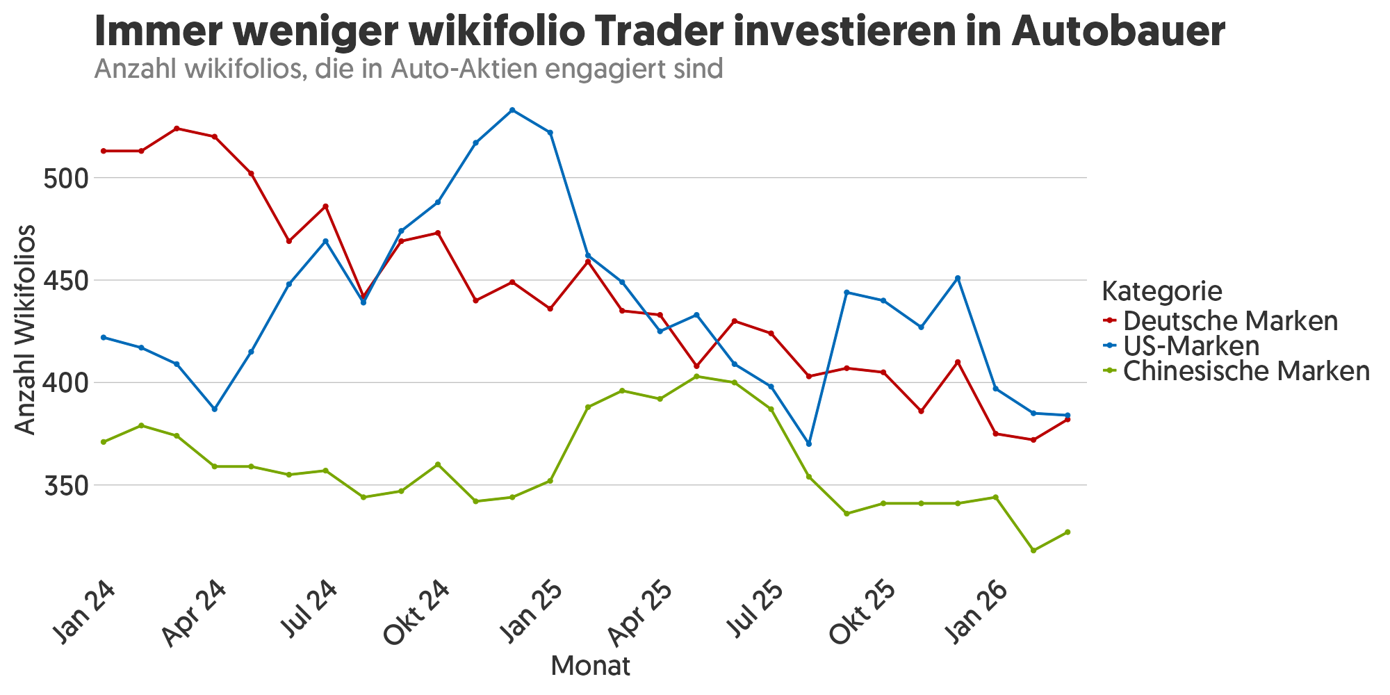 US-Zölle, maue Verkaufszahlen vorrangig in China, Stellenabbau und Gewinneinbrüche: Die deutschen Autobauer kommen aus den Negativschlagzeilen nicht heraus. Kürzlich meldeten zum Beispiel und horrible Zahlen. Beim Volkswagen-Konzern brach der Gewinn um 44 % ein. Bei der Tochter Porsche sogar um 91 %. Nachdem Porsche schon vor Jahren auf Elektrifizierung gesetzt hatte, der Erfolg aber ausblieb, setzt der Autobauer nun wieder auf Verbrenner und Hybride. Der Schwenk kostete Milliarden. Porsche-CEO Michael Leiters dazu: „Wir stehen für kompromisslos gute Sportwagen, die man selbst fahren will – unabhängig von der Antriebsart.“ Ob das eine valide Strategie für die Zukunft ist, wird sich weisen. An der Börse haben die Aktien von Porsche, oder auch VW auf Monatssicht nochmal zweistellig an Wert verloren. Das Autobauer-Exposure fahren die wikifolio Trader seit Monaten zurück. Deutsche Autobauer stecken aktuell nur mehr in weniger als 400 wikifolios. Anfang 2024 waren es noch über 500. Beliebteste Auto-Aktie ist , gefolgt von und . Der chinesische Autobauer überholte damit zuletzt VW oder auch Porsche. Und macht jüngst auch an der Börse eine gute Figur. Die Aktie verteuerte sich in nur einer Woche um gut 6 %. Top-Holding ist sie z.B. in Manuel Bauers wikifolio Robotics, Automation, Smart Home .