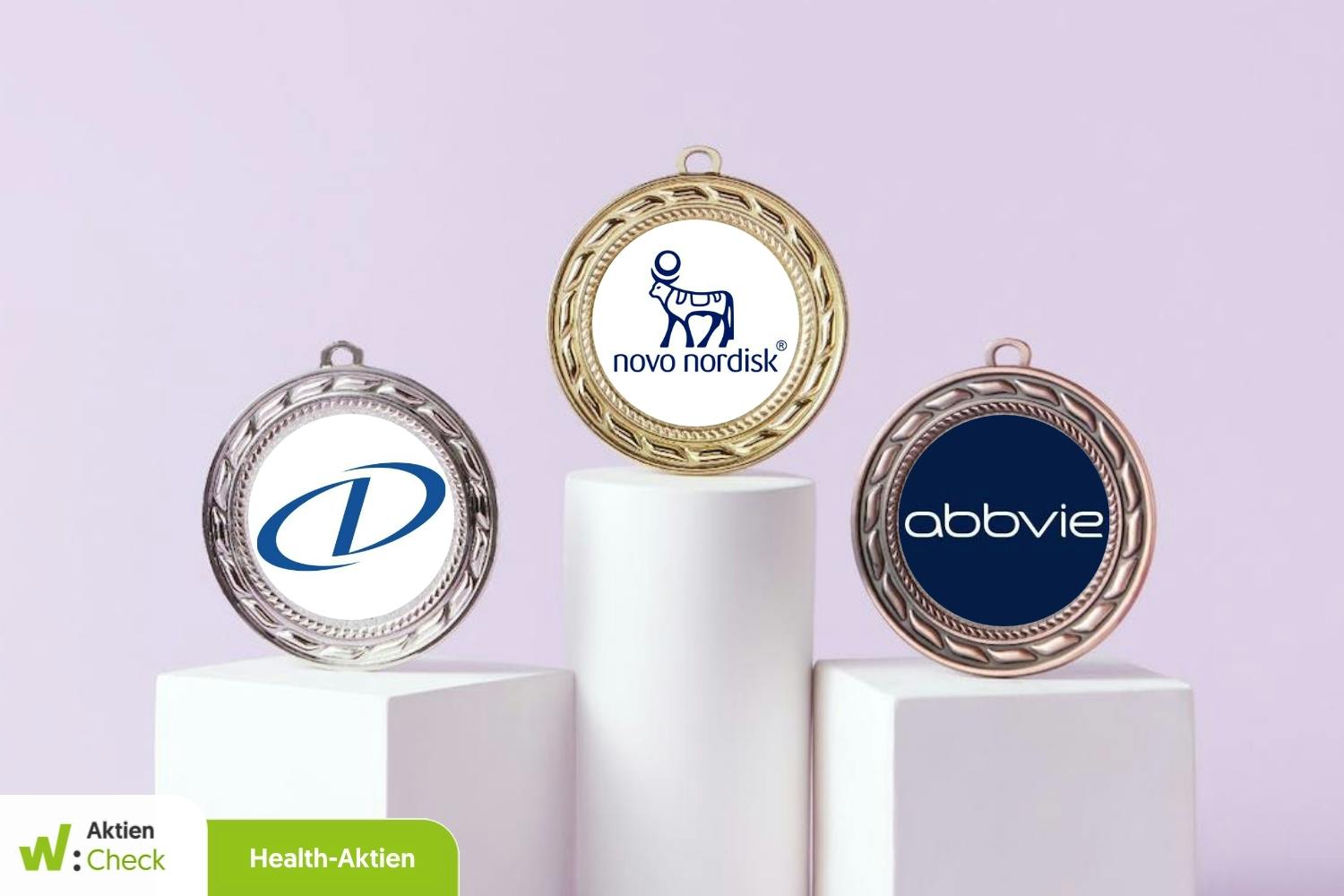 Siegertreppchen mit Medaillen auf denen Logos von Novo Nordisc, Danaher und Abbvie zu sehen ist