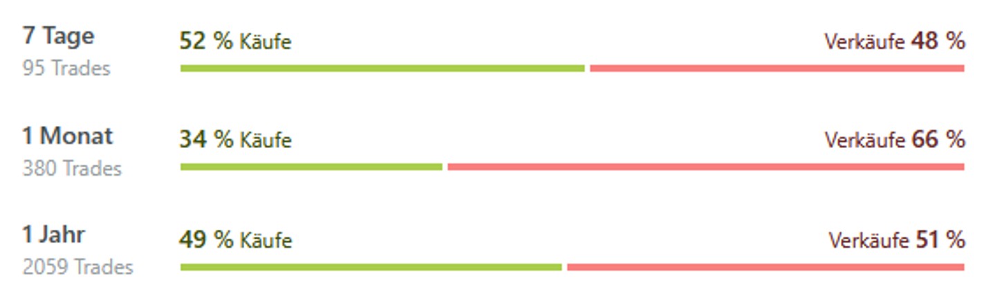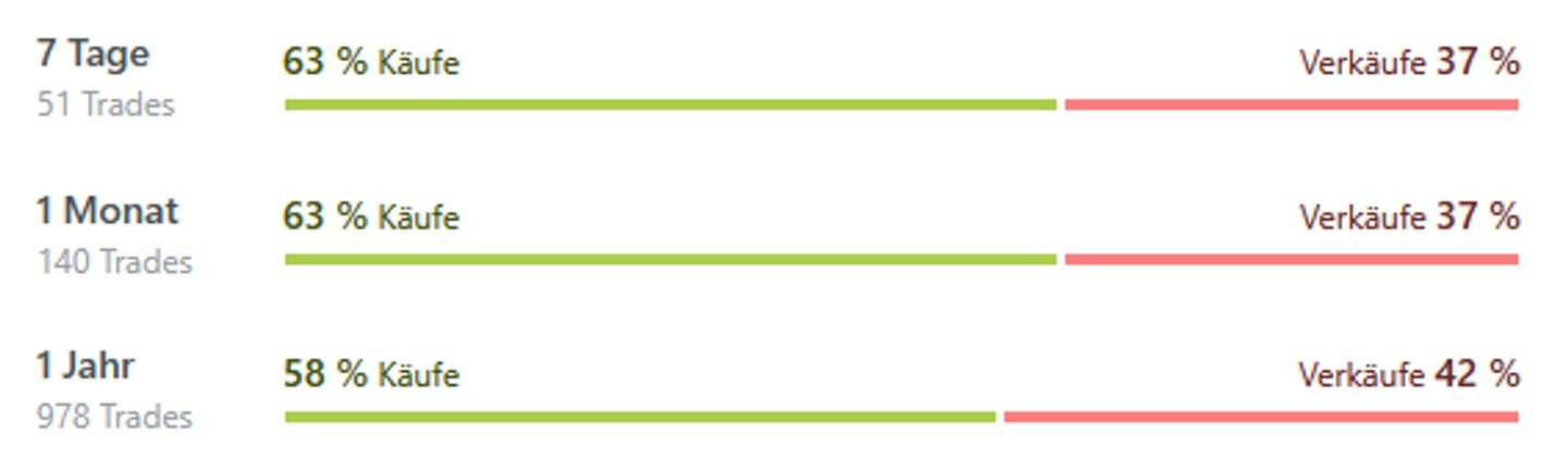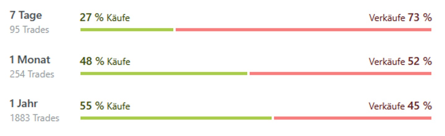 Die wikifolio Trader reagierten unterschiedlich auf die jüngsten Entwicklungen. Das aktuelle Trading-Sentiment zeigt für die vergangenen sieben Tage ein ausgeglichenes Bild. Auf Monatssicht überwogen allerdings klar die Verkäufe. Aleksandr Kasko-Spak hat diese Bilanz maßgeblich mitgeprägt. Der Trader hat den Bestand an flatexDEGIRO-Aktien in seinem wikifolio Aktien Zukunft Chance. in diesem Zeitraum deutlich reduziert. Der bislang letzte Verkauf bescherte ihm am vergangenen Montag einen Gewinn von rund neun Prozent. In dem aktuell 34 Werte enthaltenen Portfolio ist die Aktie jetzt nur noch mit 0,9 Prozent gewichtet. Kasko-Spak setzt bei einem mittel- bis langfristigen Anlagehorizont auf Unternehmen aus „Wachstumsbranchen“ wie Digitalisierung, Internet, künstliche Intelligenz, Blockchain, Cloud-Computing, medizinische Forschung oder Wasserstoff. Das im Sommer 2020 eröffnete Depot kommt bislang auf eine Performance von 239 Prozent oder knapp 25 Prozent im Jahresschnitt.