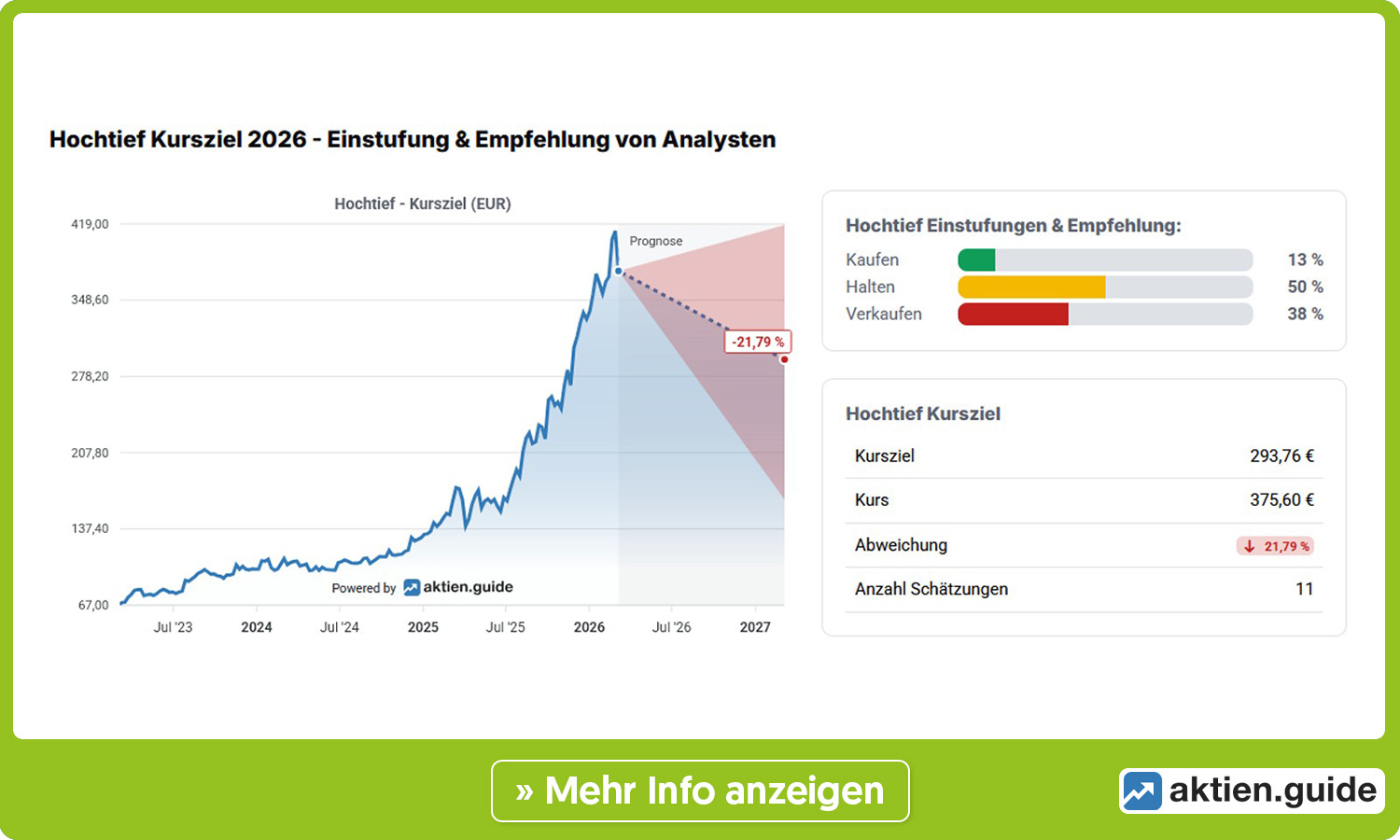 Die Mitte Februar vorgelegten Zahlen zum abgelaufenen Geschäftsjahr bestätigten die starke operative Entwicklung noch einmal. Der operative Konzerngewinn stieg um 26 Prozent auf 789 Millionen Euro und lag damit über der erhöhten Guidance. Der Auftragseingang legte um 32 Prozent auf 52,6 Milliarden Euro zu, der Auftragsbestand erreichte mit 72,5 Milliarden Euro ein Rekordniveau, und für 2026 stellte Hochtief ein weiteres Gewinnwachstum von 20 bis 30 Prozent in Aussicht. Ein zusätzlicher Treiber war erneut das Datacenter-Geschäft: Turner wurde im Februar als einer der Auftragnehmer für Metas 10-Milliarden-Dollar-Rechenzentrumscampus in Indiana ausgewählt. Genau diese Mischung aus Gewinnwachstum, prall gefülltem Auftragsbuch und KI-Infrastrukturboom hatte den Kurs bereits in den vergangenen Monaten so stark nach oben getragen.
