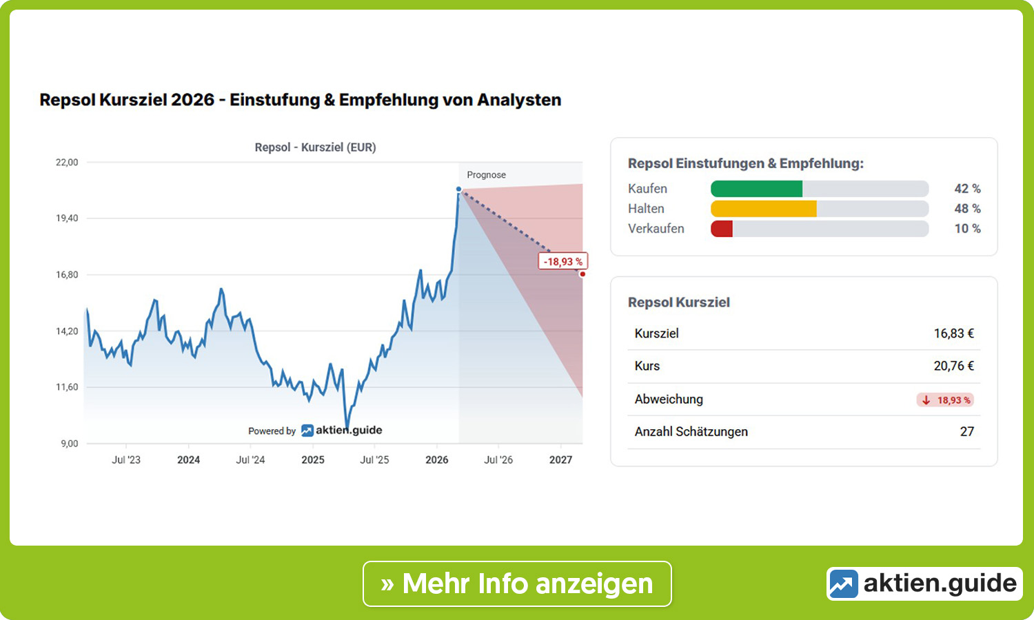 Repsol profitiert dabei vor allem von seinem direkten Exposure zu den Öl- und Gaspreisen und der Erwartung, dass die Förderseite bei höheren Preisen deutlich mehr Cashflow abwerfen kann. Hinzu kommt, dass das Unternehmen schon vor dem Krieg mit guten Ergebnissen überzeugen konnte. Bei den Mitte Februar veröffentlichten Zahlen für das abgelaufene Geschäftsjahr hatte Repsol für 2026 eine höhere Produktion von 560.000 bis 570.000 Barrel Öläquivalent pro Tag in Aussicht gestellt. Zudem will der Konzern über Dividenden und Rückkäufe rund 1,9 Milliarden Euro an seine Aktionäre ausschütten und erwartet aus dem Pikka-Projekt in Alaska ab März zusätzlichen Produktionsschub. Für Fantasie sorgt daneben auch der in dieser Woche (10. März) anstehende Kapitalmarkttag, bei dem Repsol seine Ziele bis zum Jahr 2028 vorstellen will. Die Analysten der RBC haben im Vorfeld dieses Events ihr Kursziel von 16 Euro auf 20 Euro angehoben. Damit dürfte auch das Konsenskursziel weiter steigen. Das liegt laut aktien.guide aktuell noch knapp unter 17 Euro und damit recht deutlich unter der aktuellen Notierung der Aktie. Allerdings sind die aktuellen Energiepreisanstiege in den allermeisten Bewertungen noch nicht enthalten.
