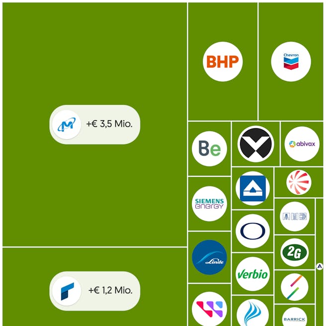 Die Größe jeder Box entspricht dem absoluten Gewinnbeitrag. Während Micron Technology als Tech-Champion mit 3,46 Millionen Euro (+14,2%) dominiert, zeigt Rheinmetall mit 1,25 Millionen Euro (+5,62%) die Stärke der Rüstungsbranche. Energiewerte wie Siemens Energy und Bloom Energy sowie Rohstoff-Giganten wie BHP und Chevron runden die Liste ab. Besonders stark positionierte wikifolios wie NoLimits profitierten von ihrer Tech-Ausrichtung.